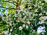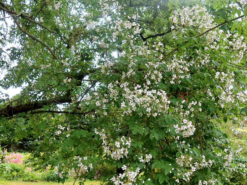I bought a batch of old-fashioned white rambling roses second-hand, back in the day, and planted them to climb up large trees in my garden. The Driveway garden's Gleditsia was paired with the rambler Kiftsgate.
